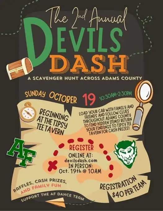 Load your car with family and friends and follow clues throughout Adams County to find hidden items. Return your findings to Tipsy Tee Tavern for cash prizes!